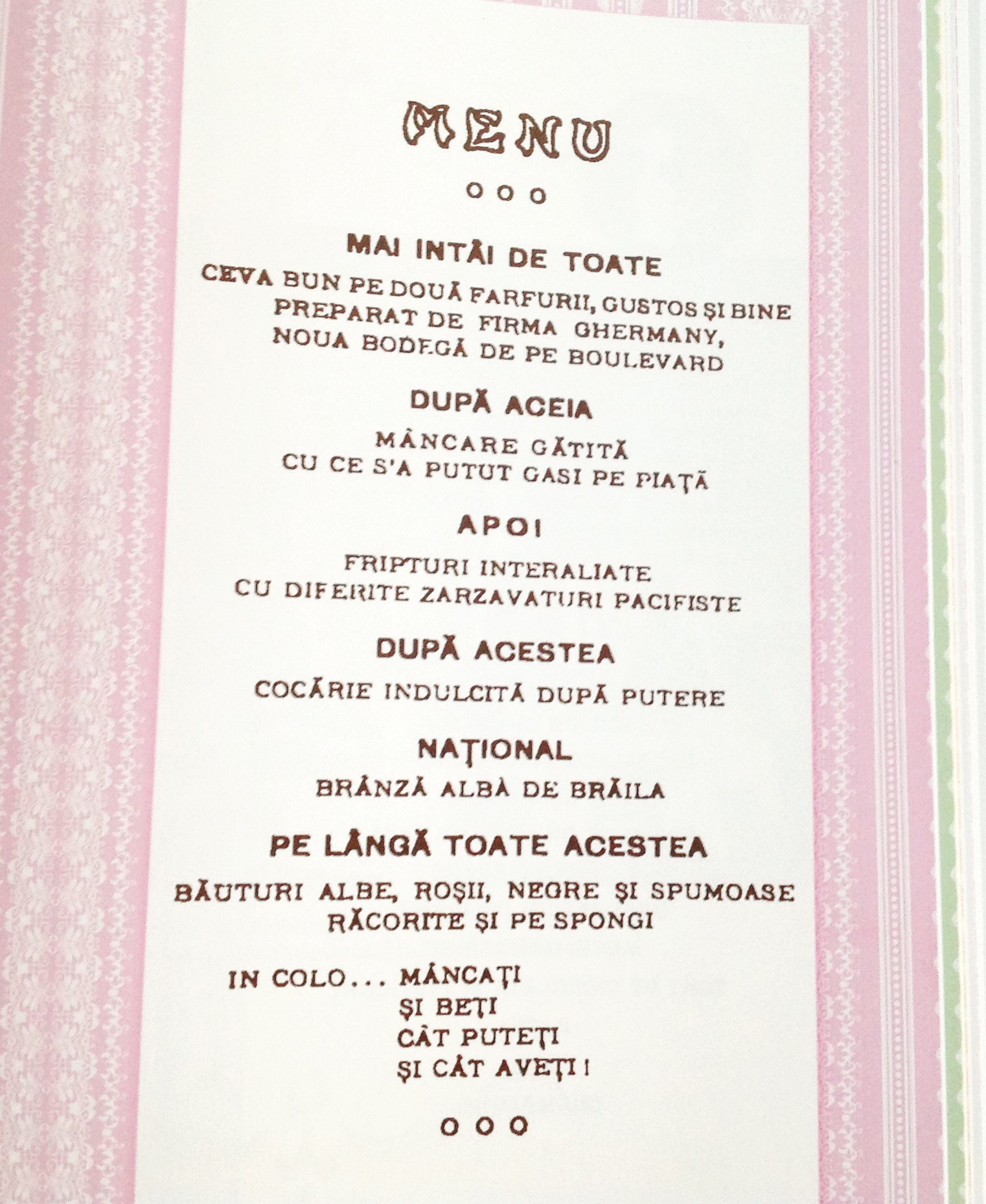 Hai să vă redau și poza de mai sus, în caz că nu puteți citi ce scrie pe ea. Iată cum arăta un meniu: